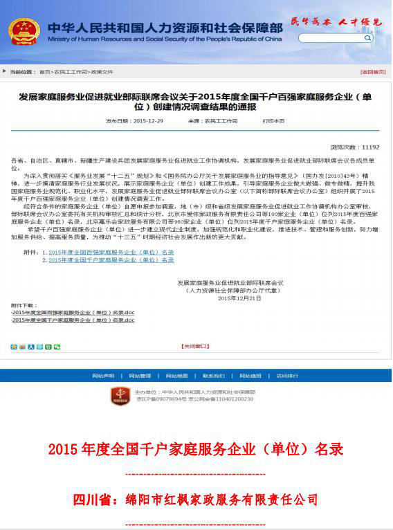 2015年12月,綿陽紅楓家政公司被國務院發展家庭服務業促進就業部際聯席會議評定爲“全國千戶百強家政服務企業”。