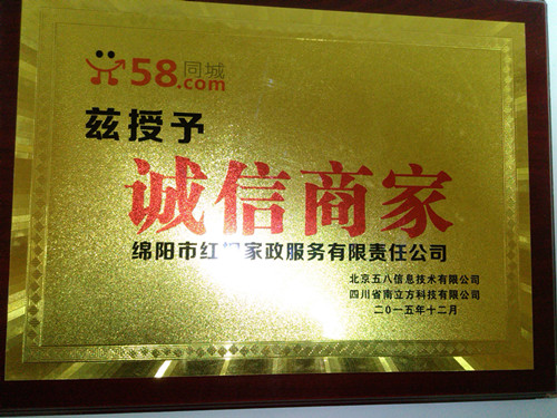 綿陽市紅楓家政公司2015年度被58同城評爲“誠(chéng)信商家”榮譽,我公司在2015年度全體員工及服務人員通過不懈努力爲客戶滿意服務,誠(chéng)信服務等到瞭(le)客戶一緻好評及高度贊揚。在此基礎上公司全體員工再接再厲向充滿夢想的2016年度挑戰更高的殊榮,讓客戶滿意,讓客戶家人滿意,讓客戶親朋友好友贊揚是我們的服務宗旨。