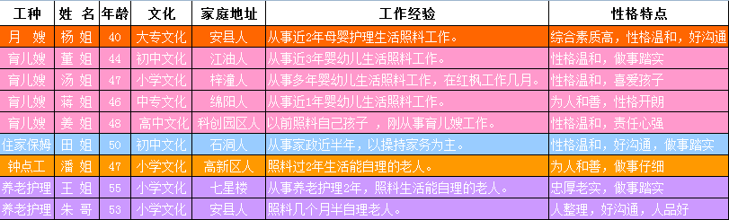 長期提供母嬰護理(月嫂)服務、育嬰(育兒嫂)服務、家務料理 、養老護理服務、病患護理、家庭保潔服務、鍾點工服務、家電清洗服務。“四化”:服務質量目标化、服務流程标準化、服務方式規範化、服務結果滿意化。“六有”:上崗有培訓、勞動有合同、服務有标準、安全有保險、法務有顧問、就業有高薪。本周可供先擇的服務阿姨如下: