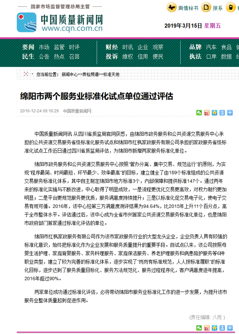 2019年3月15日起,綿陽電視台公共頻道2套開辟瞭“315我們在行動”專題報道。該欄目報道:綿陽紅楓家政公司,美好生活标準化家政服務基地!公司是市婦聯家政服務基地,市大型家政龍頭企業,省家政服務标準化單位,省巾帼家政标準化服務培訓基地,全國“千戶百強”家政公司。公司長年提供月嫂、育兒嫂、養老、保潔、家務料理、家電清洗、鍾點工等優質的家政服務項目。
