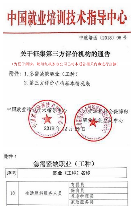 2018年12月29 日,國家人社部職業技能鑒定中心和中國就業培訓技術指導中心聯合發布瞭《關於征集第三方評價機構的通告》,“家政服務員”被認定爲“急需緊缺職業(工種)”,並将開展職業技能等級認定。