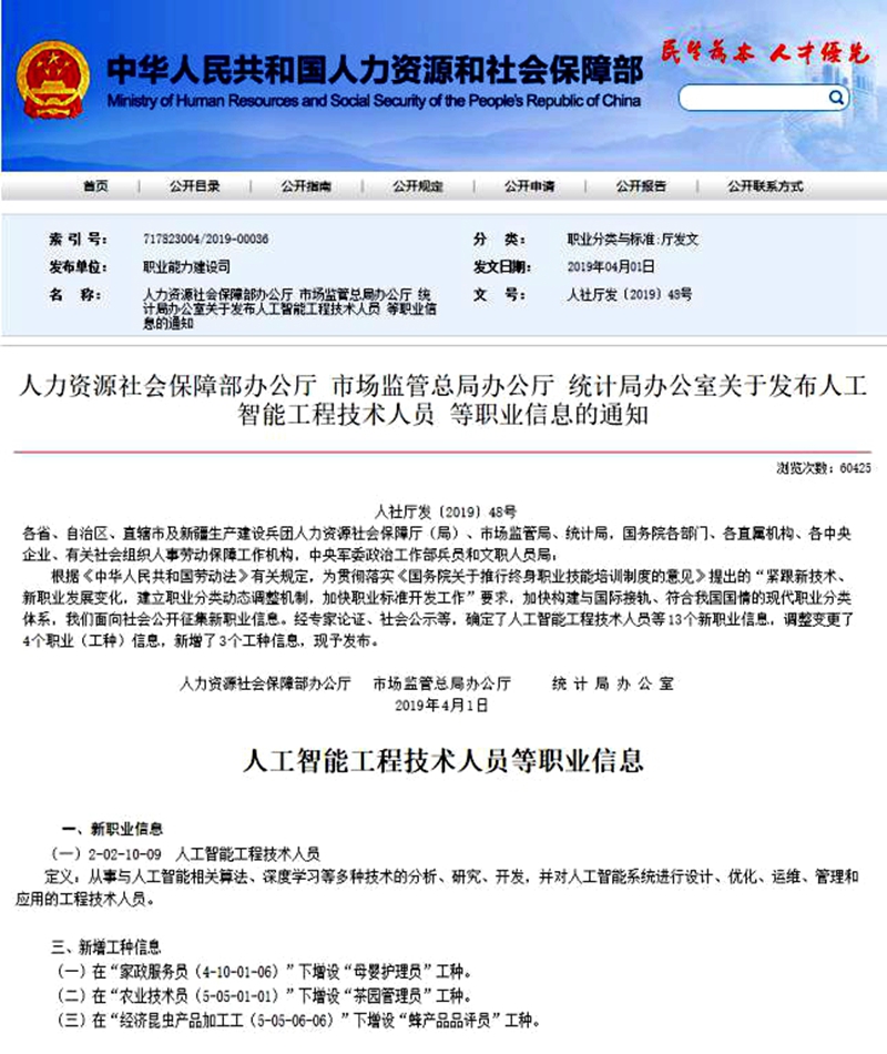 2019年4月1日,國家人社部辦公廳、市場監管總局辦公廳、統計局辦公室聯合發布瞭《關於發布人工智能工程技術人員等職業信息的通知》,“母嬰護理員”正式成爲“家政服務員”中的一個新的工種。