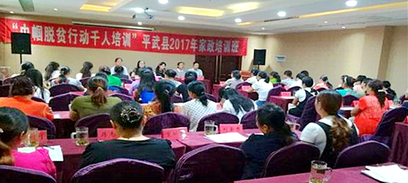 近年來,綿陽紅楓職校先後30多次選派多名教師,深入到市公安局收容教育所爲貧困失足青年女性開展就業創業技能培訓,學校用愛心和責任,以實用的專業技能和豐富的理論知識,幫助瞭1000餘人次的貧困失足女性。2017年8月,學校積極參加省婦聯組織的“巾帼脫貧行動·千人培訓計劃”,選派巾帼志願者講師遠赴平武縣,集中開辦瞭“‘巾帼脫貧行動千人培訓’平武縣2017年家政培訓班”,對該縣20個鄉鎮的50名貧困婦女進行家政服務技能培訓,《綿陽日報》、《綿陽政務網》、《平武政務網》、《綿陽志願者網》等媒體先後對此進行瞭報道。今年3月以來,積極配合綿陽紅楓家政公司參與省婦聯組織的“省級家政服務進社區試點項目”中的家政服務技能培訓、家庭服務提能培訓、家庭公益服務等社會服務工作,幫助廣大婦女提升職業技能,促進社區家庭創建美好生活。