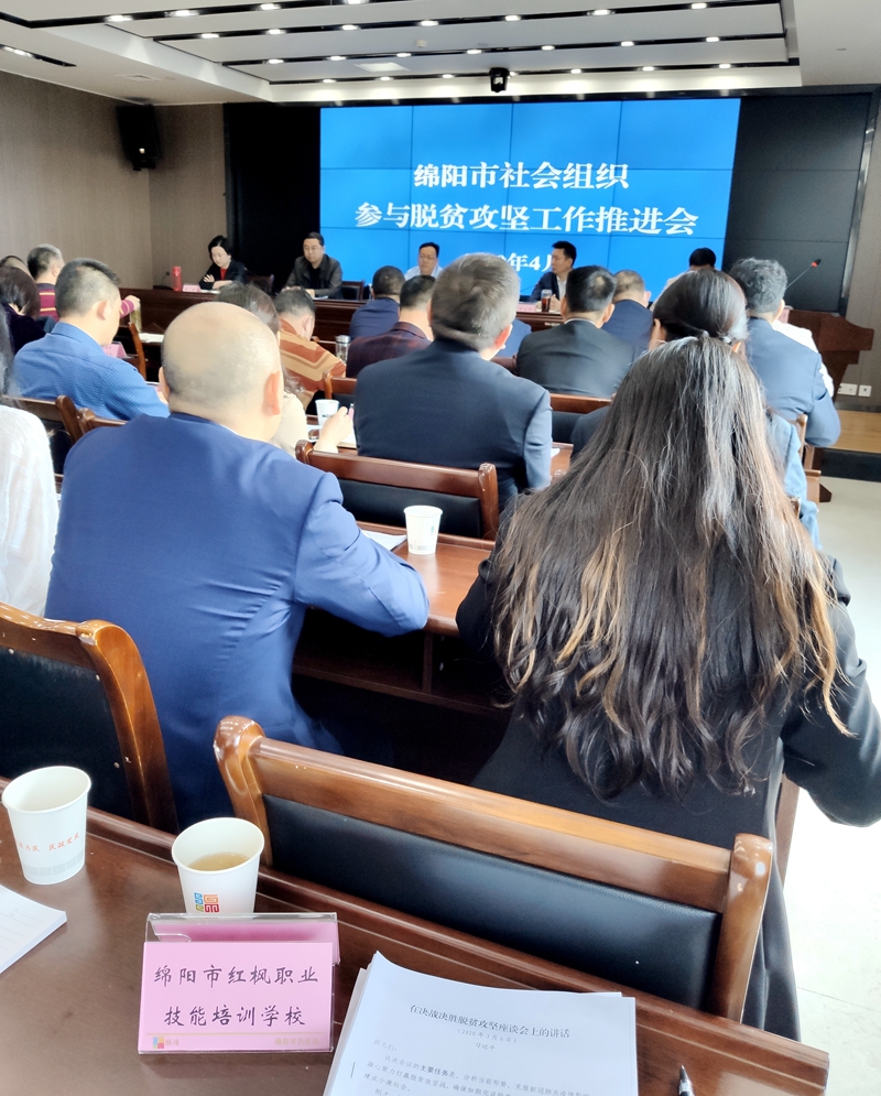 4月16日,綿陽紅楓職校負責人參加瞭“綿陽市社會組織參與脫貧攻堅工作推進會”。該會議由市民政局主辦,市民政局黨組成員、社會組織第二綜合黨委書記吳寶玉主持,市民政局黨組書記、局長胡科出席會議並講話。市民政局分管領導、相關科室負責人、各縣(市、區)民政局長和40餘家全市性社會組織代表參加會議。