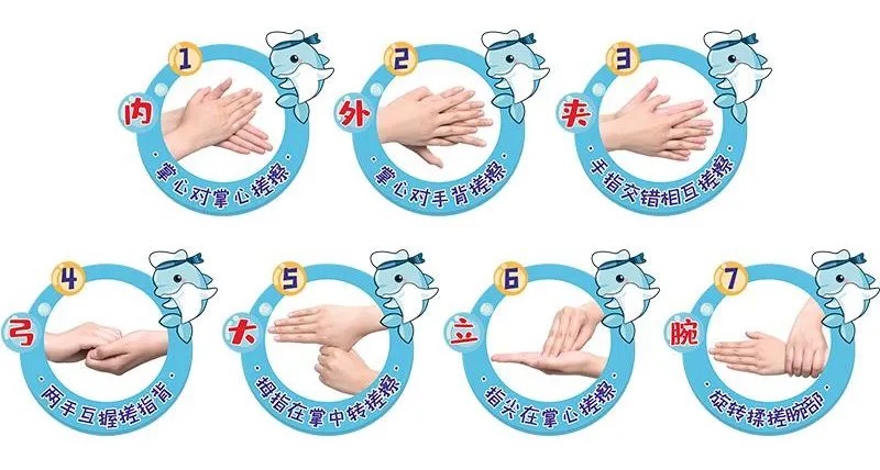 隻搓揉手心,那就隻有手心能達到消毒效果,所以要想完成手部的消毒,就必須嚴格按照“内外夾弓大立腕”這七步洗手法來進行消毒,具體的操作步驟請看下圖。