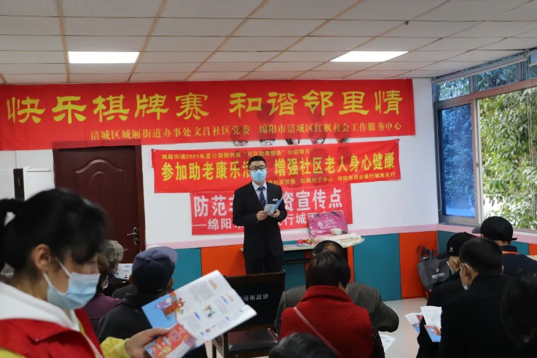 活動開始前的候場(chǎng)時段,考慮部分老人距離活動場(chǎng)地稍遠,我們邀請到綿陽市商業銀行爲社區老年人進行老年人金融防詐騙宣講,普及防範金融風險知識,引導老年金融消費者合理選擇與自身特點相适應的金融産(chǎn)品和服務,增強風險防範意識和責任意識,保護好自身權益。