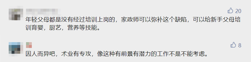 許多網友表示理解:“像這種有前景有潛力的工作不是不能考慮。”“家政師可以給新手父母培訓育嬰,廚藝,營養等技能。
