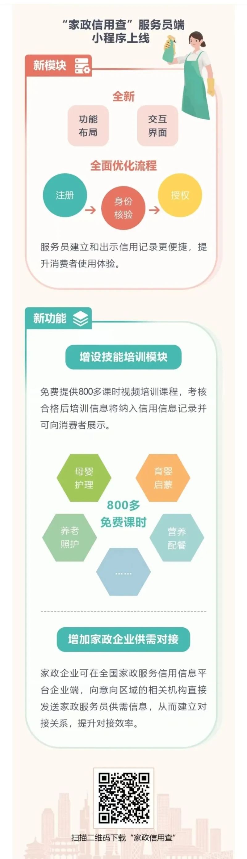 爲加強家政行業人才隊伍建設,促進家政服務業提質擴容,更好滿足人民群衆美好生活需要,國家商務部、人力資源社會保障部、全國婦聯自2023年11月起在全國組織開展“家政服務員技能升級行動”,爲全國家政從業人員提供免費線上培訓。