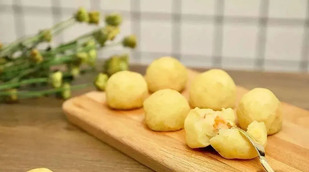 2.土豆泥加入少許澱粉搓成小圓餅,中心加入豬肉丁,奶酪切碎, 然後搓成小圓球。