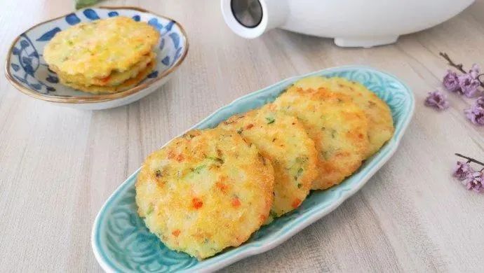 4.熱鍋熱油,倒入一勺面糊,撒上奶酪碎,底部凝固後翻面,煎至兩面金黃即可。