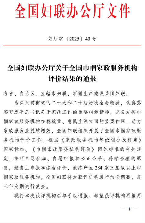 近日,全國婦聯辦(bàn)公廳印發《全國婦聯辦(bàn)公廳關於(yú)全國巾帼家政服務機構評價結果的通報》(婦廳字〔2025〕40 号),綿陽市紅楓家政服務有限責任公司憑借優質服務、規範運營及良好行業口碑,成功獲評全國四星級巾帼家政服務機構,跻身全國優秀巾帼家政機構行列!